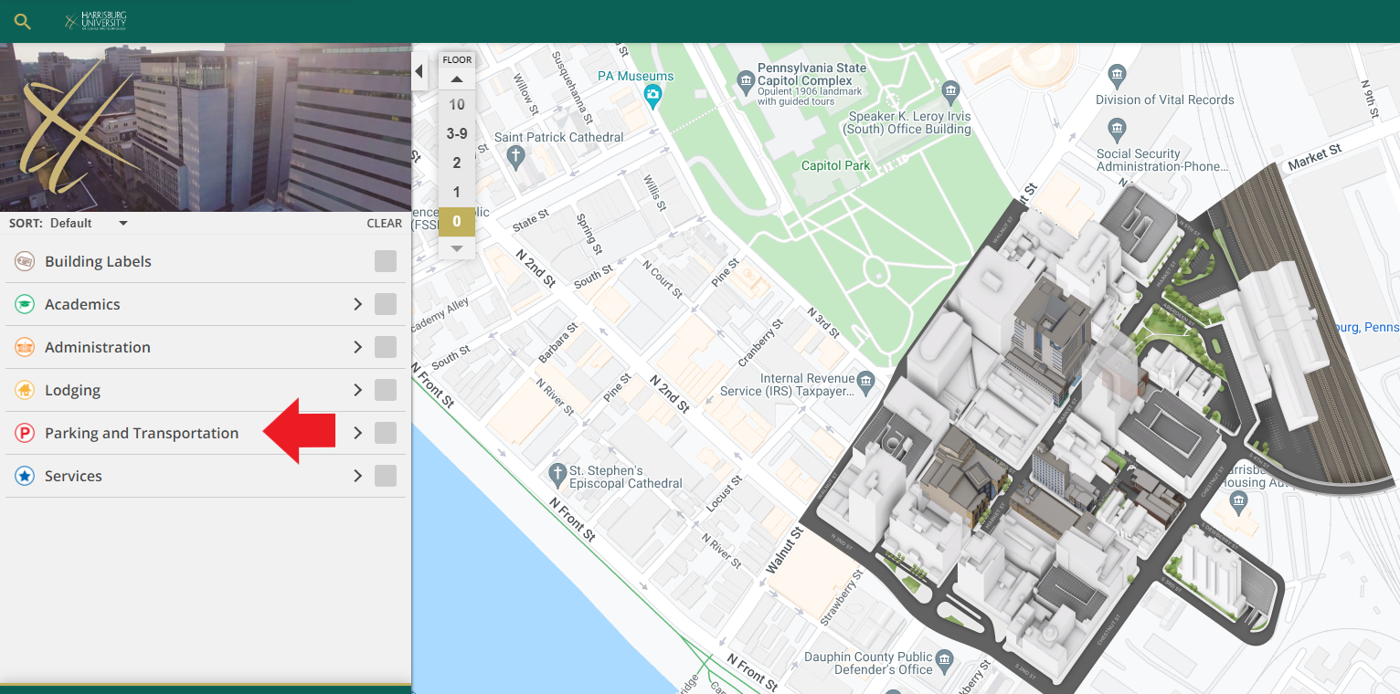 The campus has a parking garage available Monday-Saturday. The address is 326 Market Street, Harrisburg, PA 17101. Enter on 4th Street.